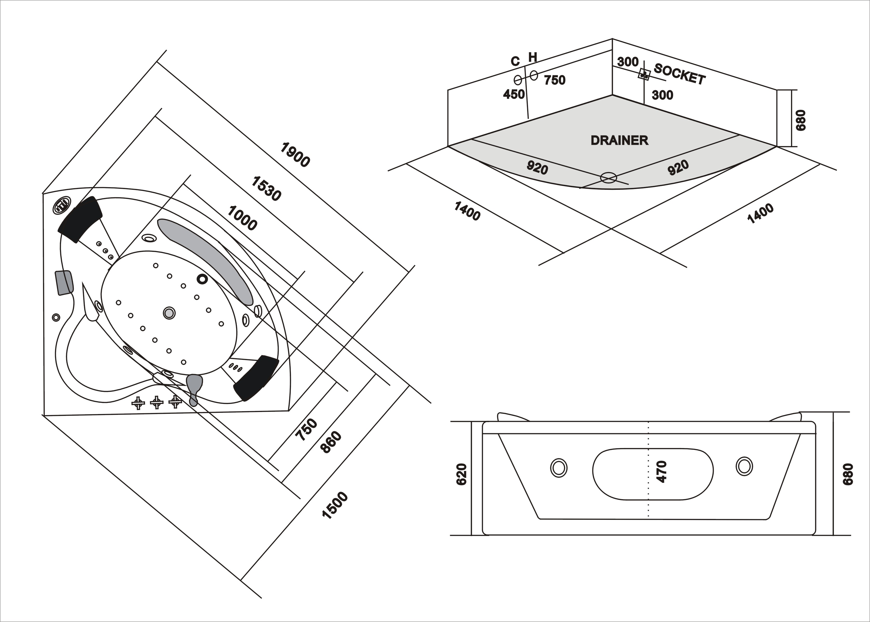 Ūdens sprauslas: 12 -2 sprauslas - sēžamvietas masāžai 4 lielas hromētas sprauslas (grozāmas) 6 ūdens sprauslas "Hydro jet" muguras masāžai